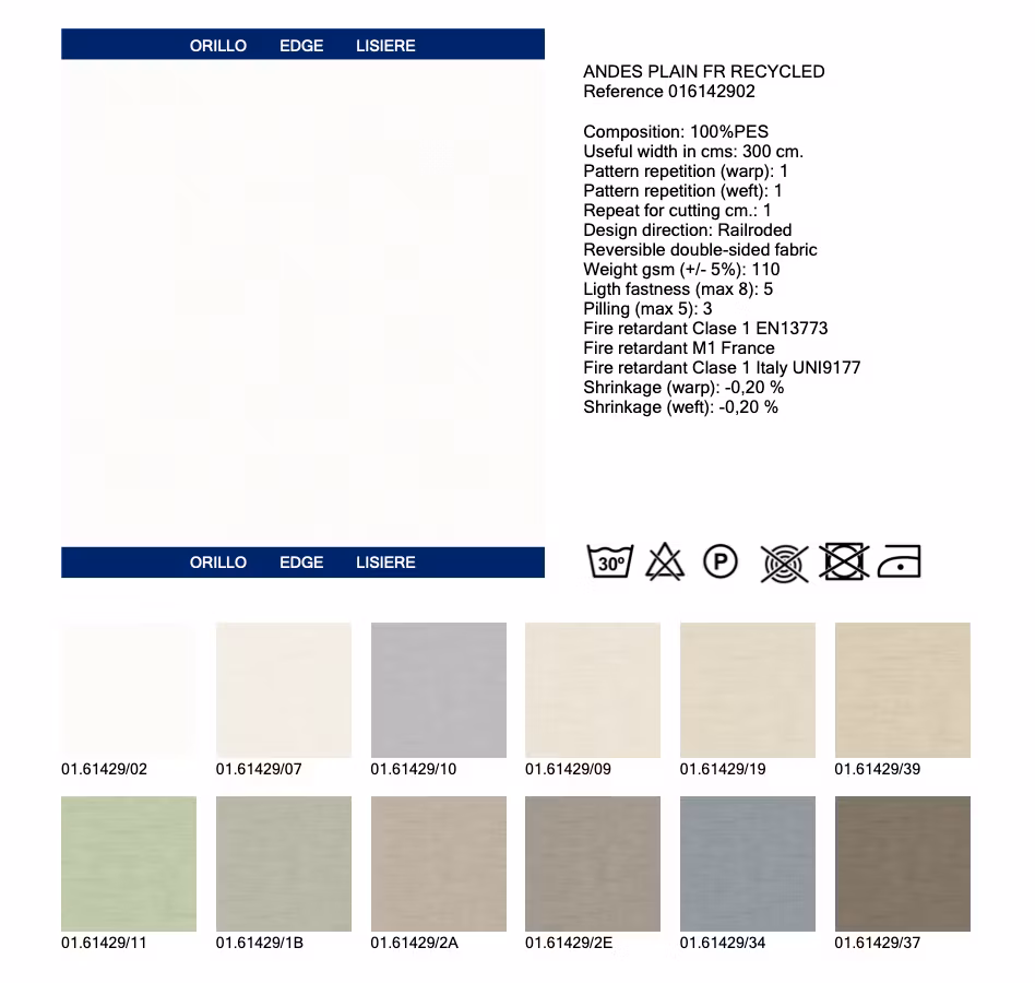 Andes Plain har en lätt strukturerad yta med linnekänsla och är tillverkat i 100 % polyester med flamskydd samt innehåller 37 % återvunnet material.