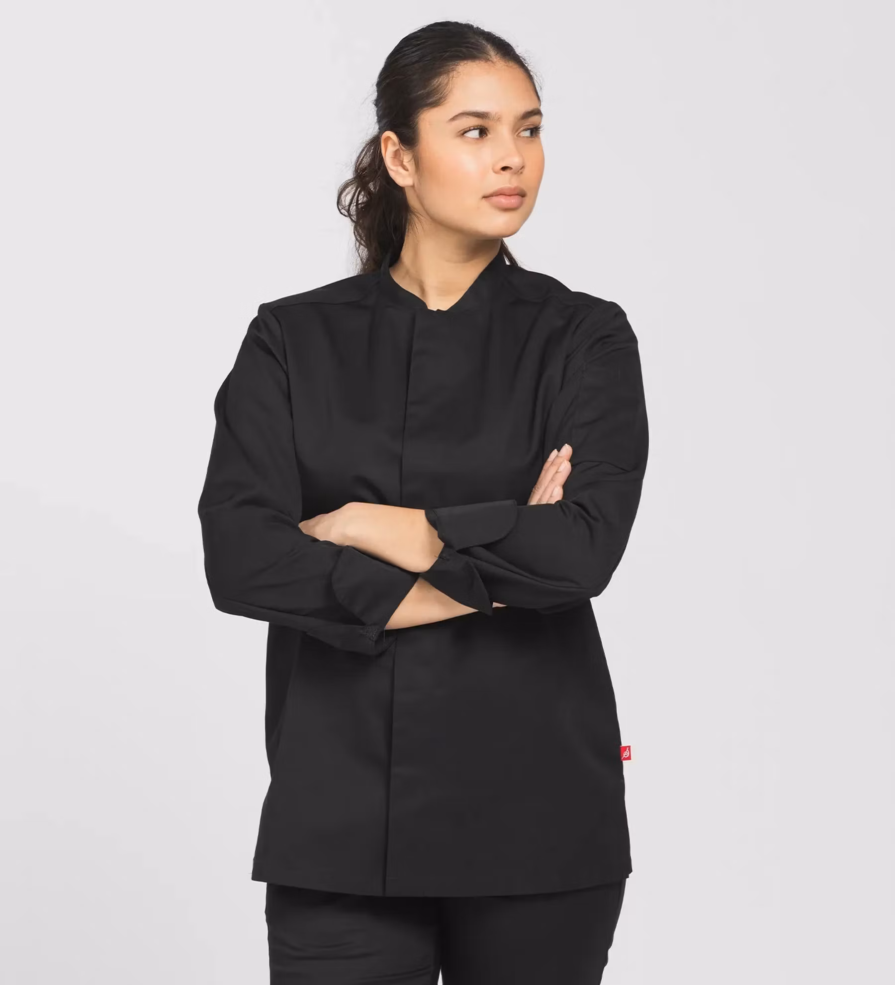 Kockrock från Segers i unisexmodell med lång ärm och funktionell passform anpassad för professionella köksmiljöer. Modellen har slitsar i sidsömmarna, pennficka på ärmen samt hank i nacken för förkläde.