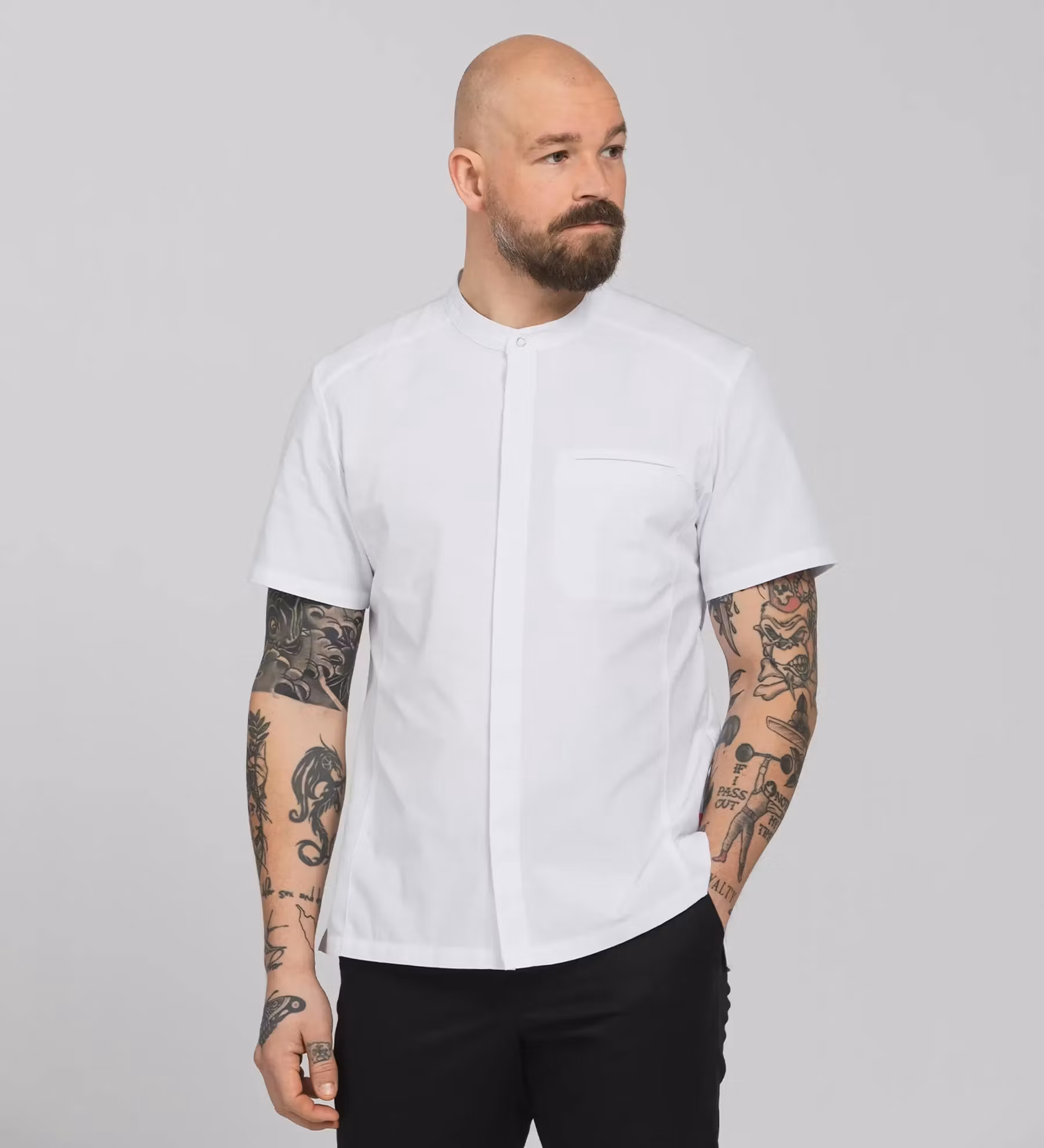 Kockskjorta från Segers i unisexmodell med lätt och luftig design inspirerad av sportens funktionella plagg. Modellen har meshpanel i ryggen med en lös konstruktion för ökad ventilation, dolda tryckknappar, bröstficka samt hank i nacken för förkläde.